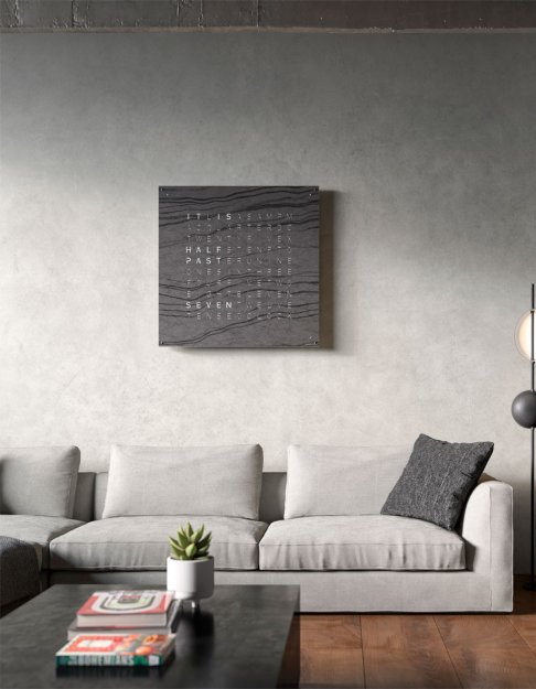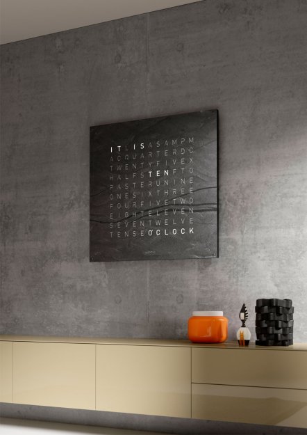 • Tid som kunst: Tiden fremstår med ord, der langsomt lyser frem – et roligt, poetisk alternativ til traditionelle ure.