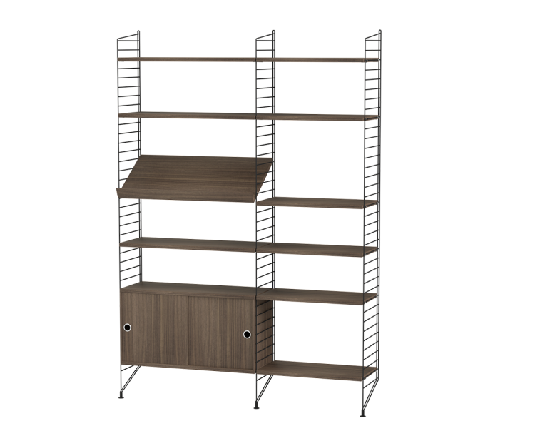 String Livingroom bundle F. Denne mellemstore kombination har det hele. Opbevar dine mest elskede genstande og bøger på hylderne, magasiner på den skrå hylde og gem de andre ting i skabet. Du vil ikke gå mangle noget med denne kombination.