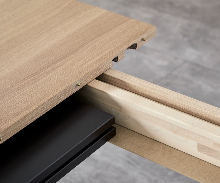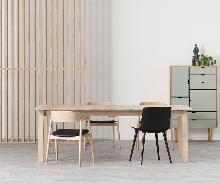 T9 spisebordet er designet med funktionaliteten i højsædet. T9 bordet på 180 cm længde har udtræk til 3 tillægsplader og magasin til opbevaring af 2 plader, mens bordet i 220 cm længde har både udtræk og magasin til 4 plader. Den nemme opbevaring af tillægsplader gør det hurtigt at forlænge bordet med op til 180 cm. Til bordet medfølger et støtteben som let monteres ved udtræk.