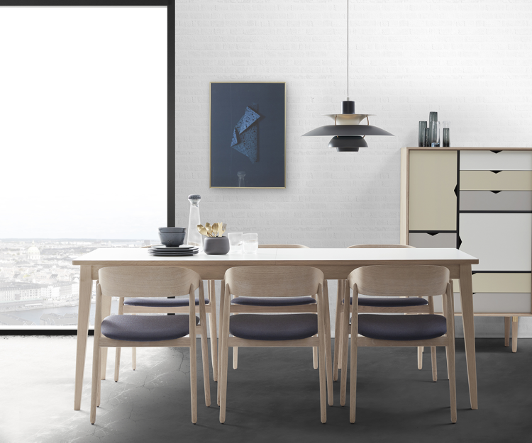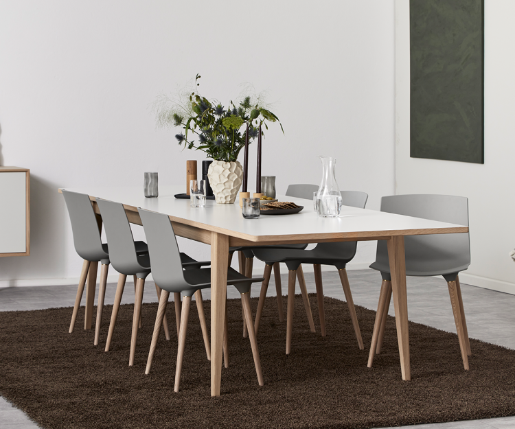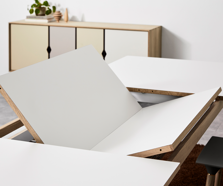 Bordets stramme kanter giver et rent og klassisk udtryk som passer godt ind i den nordiske indretning. Med den fastmonteret tillægsplade med butterfly udfold, undgås ridser på tillægspladerne og ekstra opbevaringsplads er ikke nødvendigt.