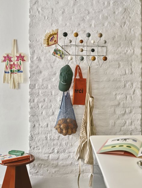 De karakteristiske, farverige trækugler giver knagerækken sit genkendelige udtryk og tilfører rummet et strejf af personlighed og liv. Samtidig fungerer de som intuitive ophæng, hvor jakker, tasker og accessories nemt finder deres plads.