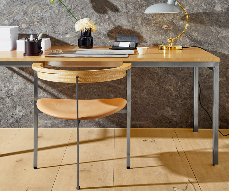 Karakteriseret ved sit trebenede satinbørstede stålstel rammer PK11™ den perfekte balance mellem bløde kurver og kantede vinkler. Den komplekse, men dog elegante, stol er designet af Poul Kjærholm i 1957 og er tænkt som den perfekte ledsager til PK51™ arbejdsbordet.