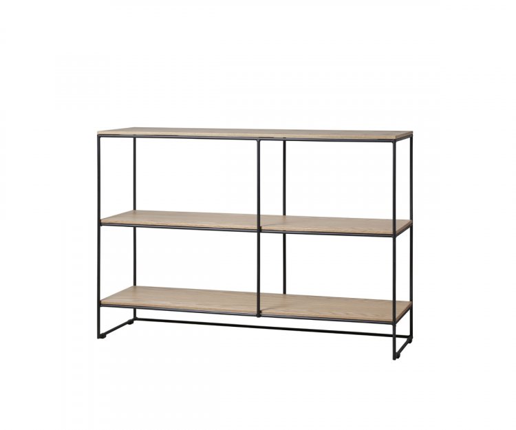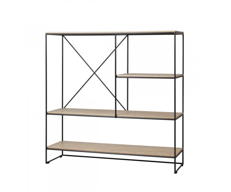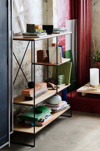 De Bauhaus-inspirerede linjer på hvert element er udført i pulverlakeret stål med en mat overflade, og samlingerne er svejset i hånden og let afrundet, så det samlede udtryk fremstår blødere. Diagonale pinde på de to større design giver ekstra støtte og samtidig særligt visuelt fokus på det efterfølgende negative rum. Hylderne er udskåret af natureg og har skrå kanter, så de passer nemt ind i stellet - en af de mange små, men vigtige detaljer.