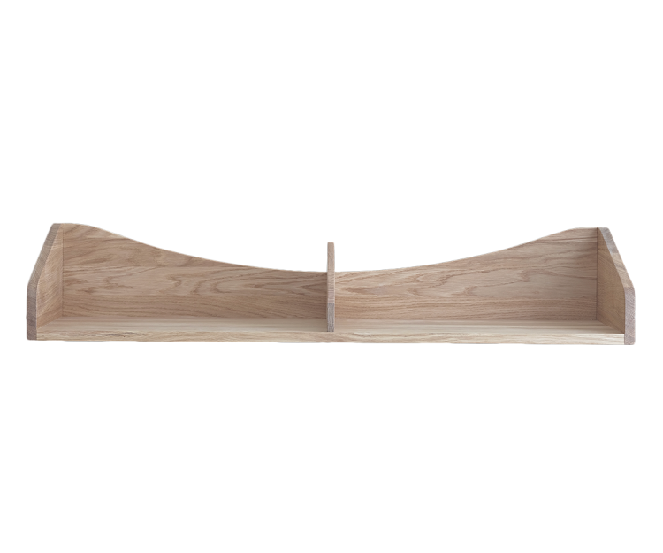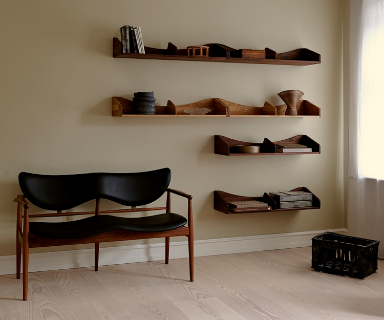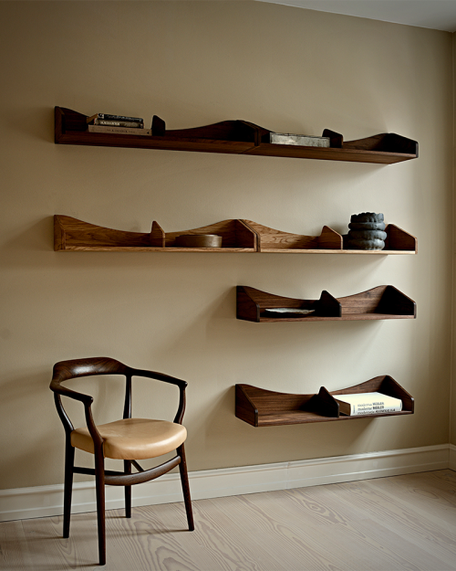 Den bølgeformede FJ 4990 Hulsø hylde fra Finn Juhl er oprindeligt tegnet i 1949 til indretningen af en såkaldt vinterstue hos magister W. Andersen i Hulsø Ege. House of Finn Juhl har genskabt hylden 75 år efter den blev tegnet efter Finn Juhls oprindelige og nøjagtige arbejdstegning med alle dens smukke detaljer. Hylden lanceres i valnød og eg og tilføjer et organisk udtryk til din indretning, især hvis flere sættes sammen. Hylden kombinerer funktion og dekoration på smukkeste vis.