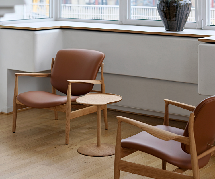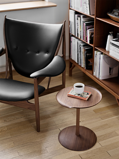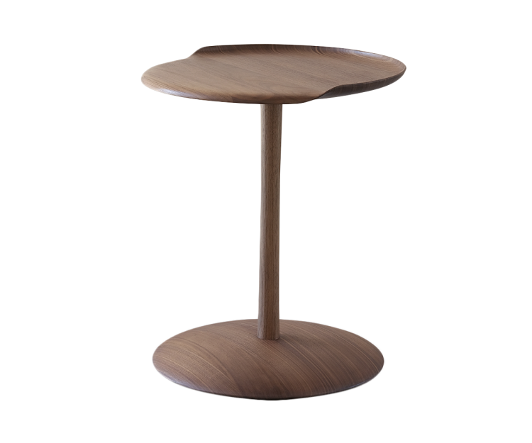 Sidebord i eg eller valnød fra Onecollection. Den definerende detalje ved Åkande-serien er kantens buede karakter. Denne funktion stræber efter at blødgøre udseendet af det hårde træ og give designet en levende og organisk form. For at opnå dette resultat spiller træ som eneste materiale en afgørende rolle da kunstige materialer aldrig ville tillade samme grad af taktilitet, varme og sanselighed.