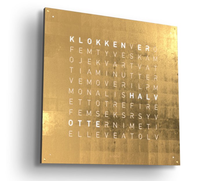 QlockTwo Earth 90 Creators Edition Gold er ikke blot et ur – det er et kunstværk. Med sin imponerende størrelse på 90 x 90 cm skaber det et markant statement i ethvert rum. Frontpladen er udført i rustfrit stål og nænsomt belagt med 24 karat bladguld, lagt i hånden, hvilket giver overfladen et levende, næsten organisk udtryk. Hver eneste bogstavudskæring er præcist bearbejdet, så guldoverfladen får en unik struktur og en kongelig fremtoning.