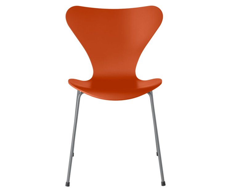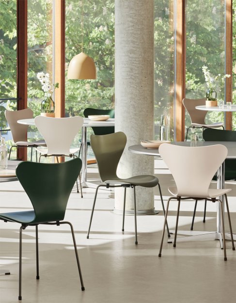 Den lakerede udgave af 3107 stolen giver et elegant og moderne udtryk, samtidig med at den fremhæver stolens organiske former. Den fås i et bredt udvalg af smukke farver og med forskellige stelvarianter – blandt andet forkromet stål eller pulverlakeret, så du kan tilpasse stolen til din personlige indretning.
