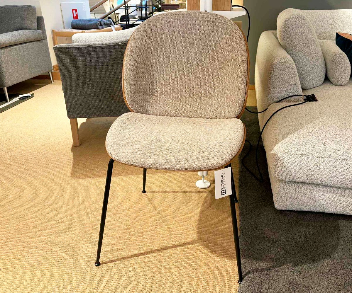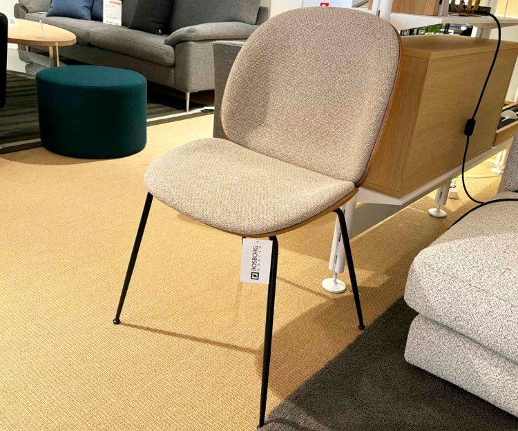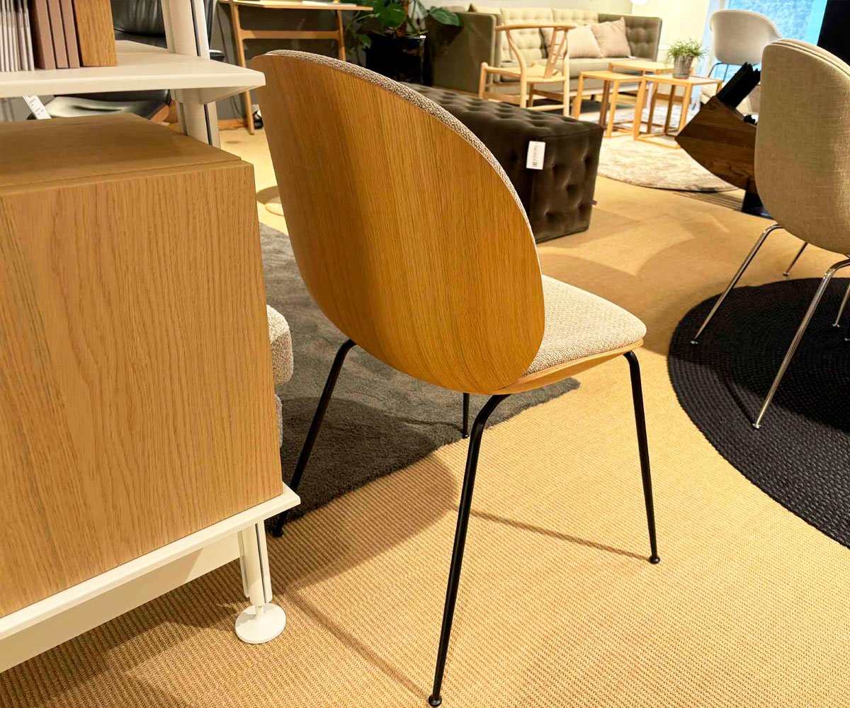 Beetle dining Chair i finer. Beetle Chairs holdbare ydre skal er en kontinuerlig, buet form, der minder om de stærke og yndefulde konturer af insektet, der inspirerede den. På trods af dens robusthed er den designet til at bøje forsigtigt, hvilket giver komfort selv efter længere tid, hvilket gør den ideel til spisning og møder. Slanke og elegante koniske metalben tilføjer en generel lethed til designet og fremhæver 'bille'-æstetikken.