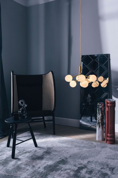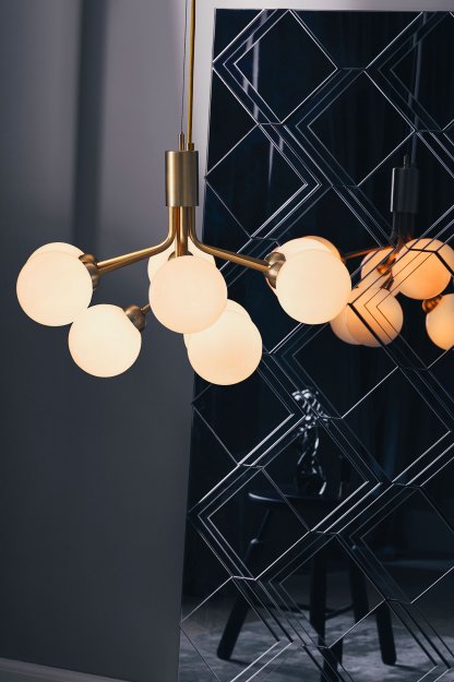 Med inspiration fra blomster har Sofie Refer designet den nye lysekronekollektion, Apiales. Apiales 9 består af ni mundblæste glaskupler og fås i gylden Brushed Brass finish eller fløjsblød Satin Black. Fra en specialproduceret kappe folder de elegante rør sig ud som blomsterstilke og fuldendes af de mundblæste glas, hvorfra lyset spredes med ynde og sanselighed. Apiales 9, passer med sin diameter på 60 cm. over spisebordet, i soveværelset eller hallen.