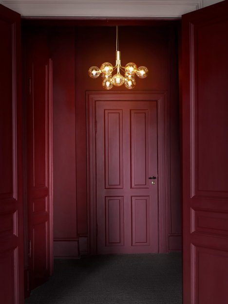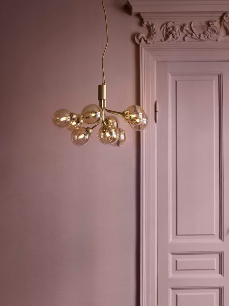 Med inspiration fra blomster har Sofie Refer designet den nye lysekronekollektion, Apiales. Apiales 9 består af ni mundblæste glaskupler og fås i gylden Brushed Brass finish eller fløjsblød Satin Black. Fra en specialproduceret kappe folder de elegante rør sig ud som blomsterstilke og fuldendes af de mundblæste glas, hvorfra lyset spredes med ynde og sanselighed. Apiales 9, passer med sin diameter på 60 cm. over spisebordet, i soveværelset eller hallen.