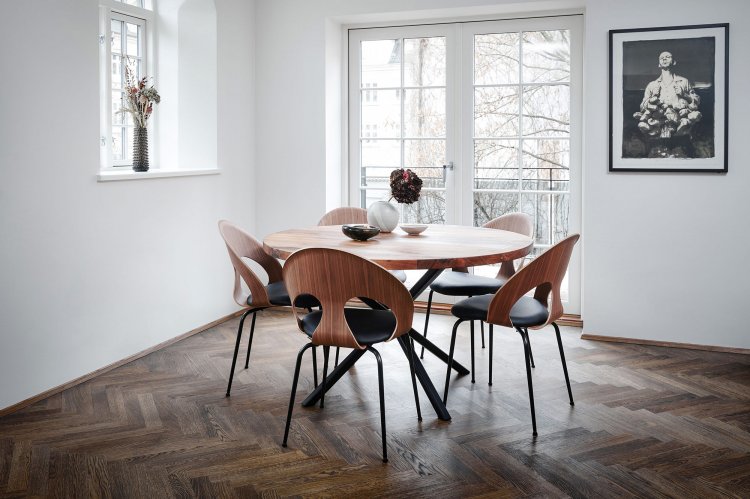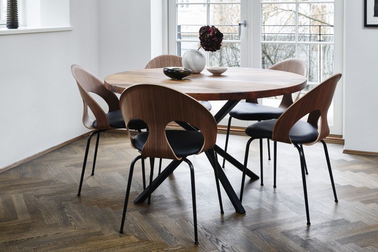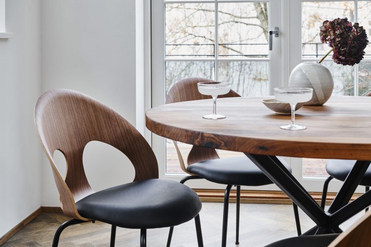 Denne unikke spisebordsstol fanger opmærksomheden med sit organisk formede ryglæn med kurver og udskæringer. Stolen udtrykker elegance i materialesammensætningen, der kombinerer et ryglæn i valnød, konisk formede stålben i sort pulverlak og sædepolstring.