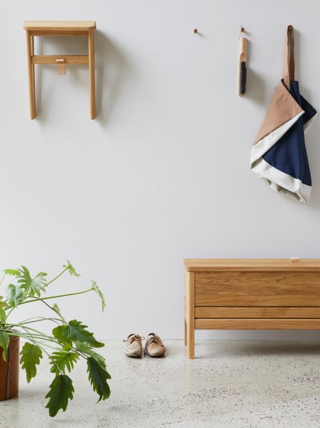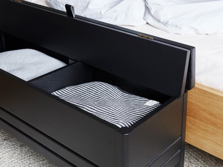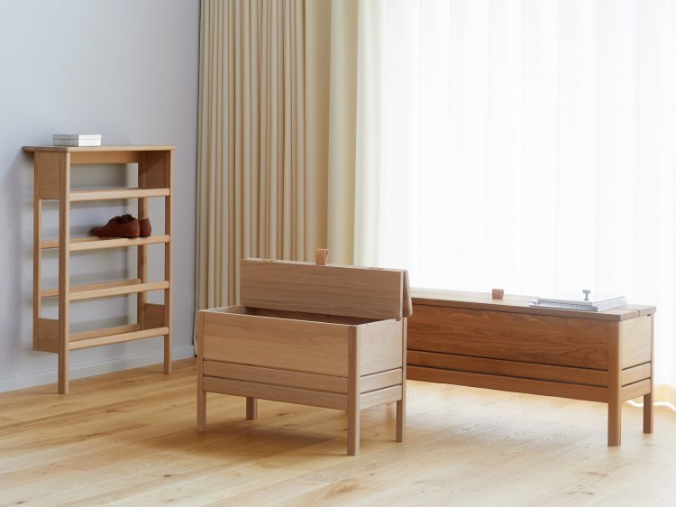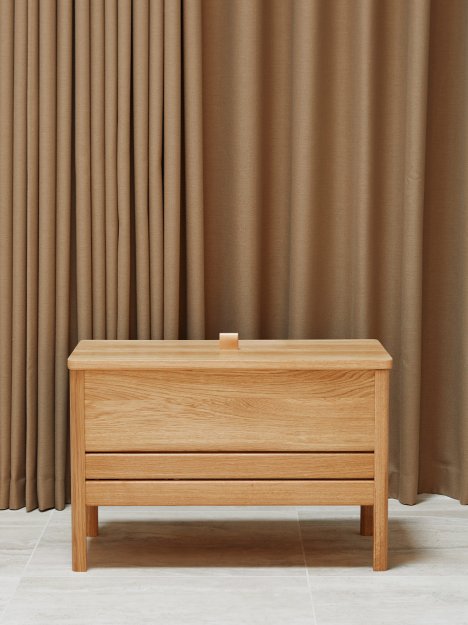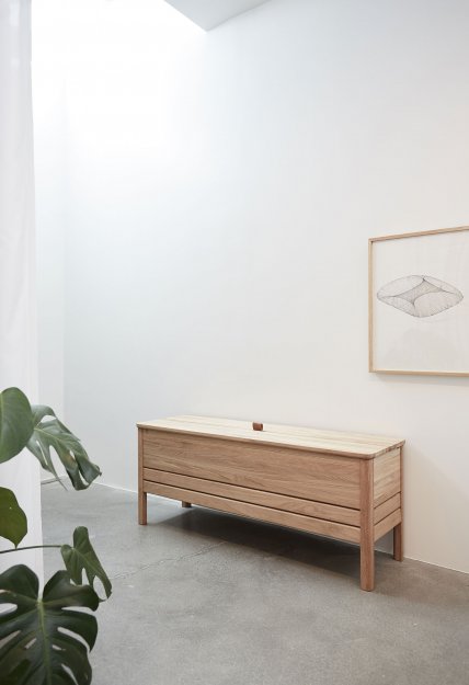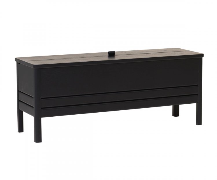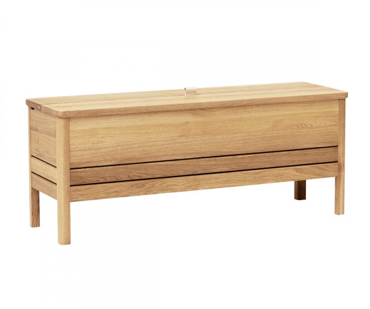 En opdateret version af den klassiske slagbænk, hvor form og funktion mødes. En solid og alsidig bænk med lettere, mere reducerede dimensioner og et minimalistisk udtryk. Den har et praktisk stort opbevaringsrum, inddelt i to sektioner. Låget løftes med et lædergreb, og konstruktionen holder låget i spænd under brug. Benenes længde og vinklerne giver slagbænken en luftig fornemmelse, mens designet som helhed er solidt og robust. En alsidig bænk, der kan stå alene i en entré, i et soveværelse eller indgå i et siddearrangement.