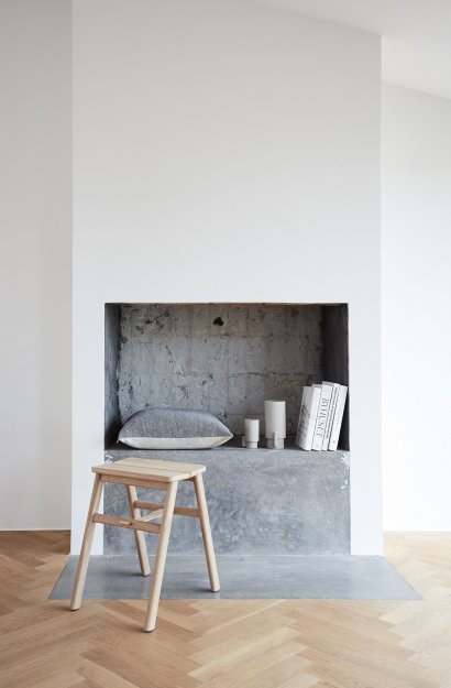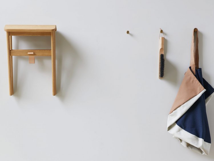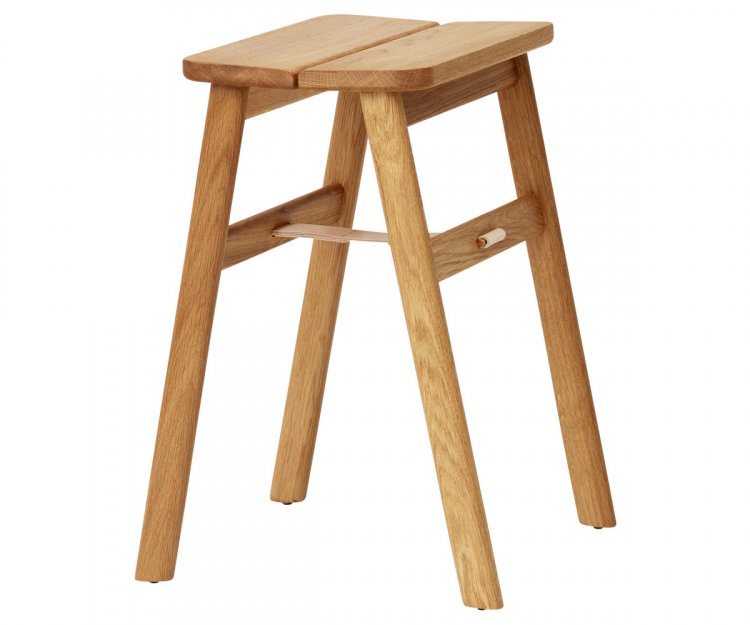 En taburet der passer til de flestes behov, både i forhold til komfort, funktionalitet og kvalitet. Skamlen har en overraskende god komfort på grund af sædets hældning på 10 grader mod hinanden. Den kan derfor bruges som ekstra siddeplads.  Læderbåndet under sædet er en fin, æstetisk detalje såvel som en bærende del af konstruktionen. Denne konstruktion gør det muligt at folde skamlen og hænge den op på væggen med den medfølgende messingkrog (Angle Brass Hook).  Alt i alt en fin, lille skammel i gode materialer til mange forskellige formål.