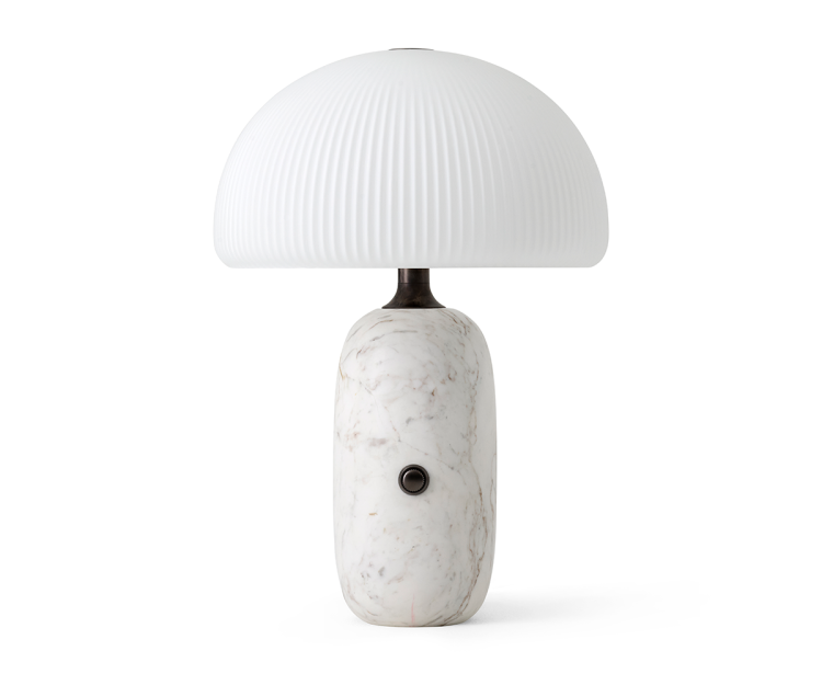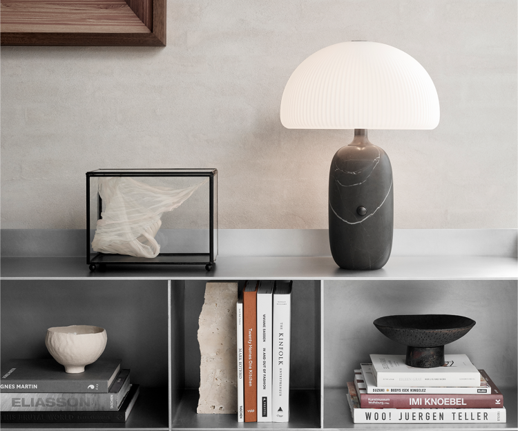 Sculpture bordlampen fungerer som en dekorativ skulptur formet i glas og massiv marmor. En kuppel af glas udstråler et blødt lys, der oplyser marmorbundens unikke træk. Integreret i den massive marmorbund er en raffineret lysdæmper og kontakt.