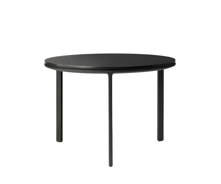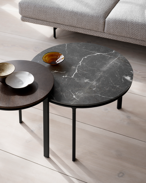 Vipp sofabordet er et alsidigt bord til stuen. Bordet fås også i en større version, og har en sort, pulverlakeret aluminiumsramme på tre ben, der bærer en bordplade af enten poleret marmor eller mørk eg.