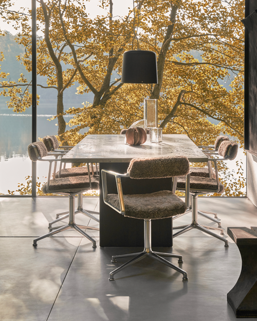 Et poleret, slankt aluminiumsstel møder tæt og rigt polstring lavet af blødt australsk fåreskind i specialudgaven af Vipp drejestolen, Curly edition. Kombinationen af ​​de industrielle elementer af metal med den blødere, men slidstærke tekstur af det australske fåreskind skaber en harmonisk kontrast, der inviterer til en hyggelig omfavnelse og en behagelig siddeoplevelse.