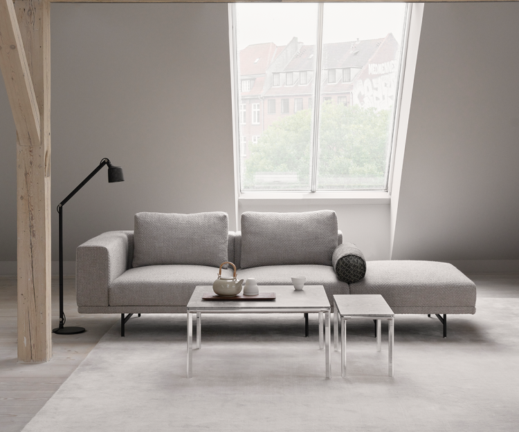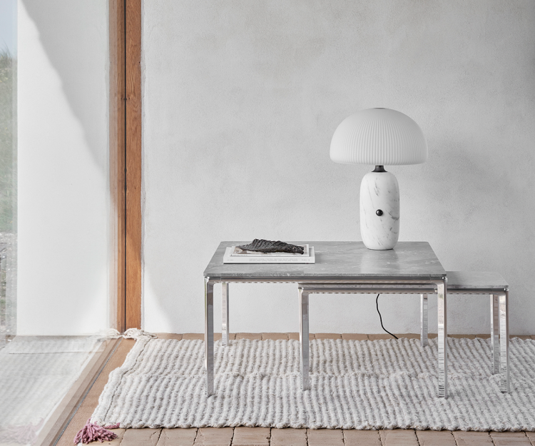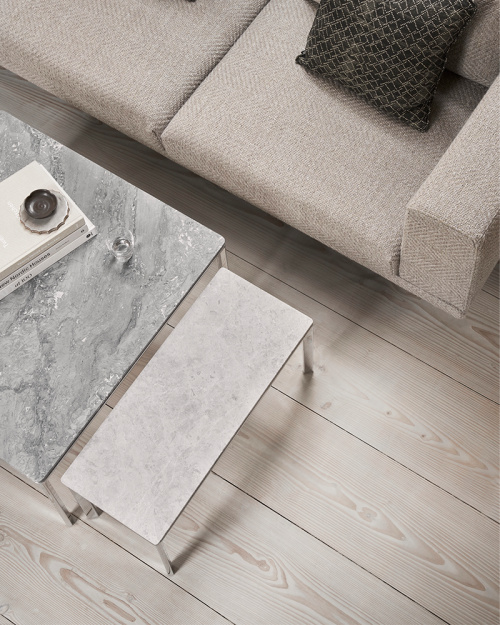 Vipp 427 sofabord i størrelsen 80x80 cm. Sofabordet har et stel af poleret aluminium og en svævende bordplade af grå marmor, der skaber et holdbart håndværk og tidløst design med sans for detaljer. Designet tilføjer materialer af høj kvalitet og raffinerede detaljer til boligen.