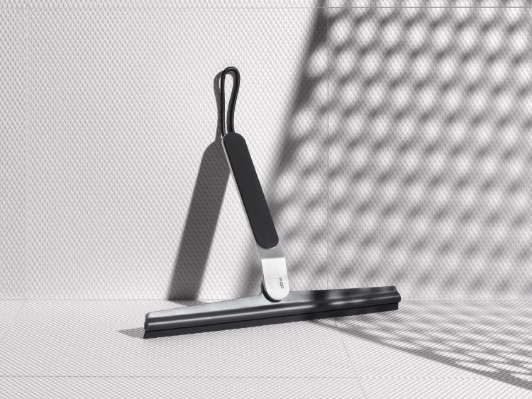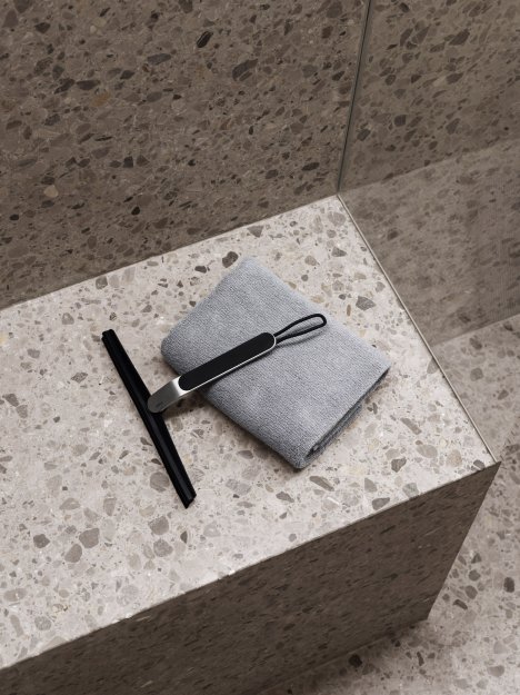 Vipp 2 Bruseskraber fjerner let vand fra de glatte overflader i badeværelset. Bruseskraberen har et udskifteligt blad og gummistrop til ophæng.