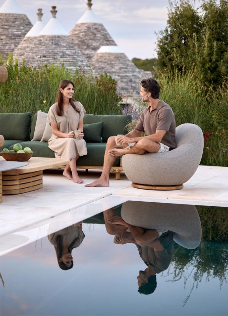 Som havestol fungerer Gem både som et solitært blikfang og som en del af en større loungegruppe. Dens moderne formsprog gør den let at kombinere med andre Cane-line havemøbler, såsom havesofaer, sofaborde, pufs og tæpper, og skaber en sammenhængende, eksklusiv atmosfære.