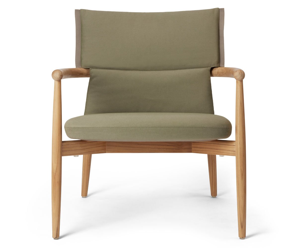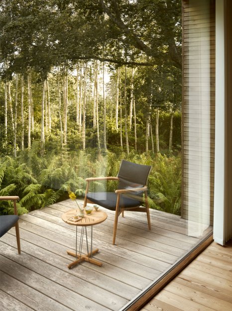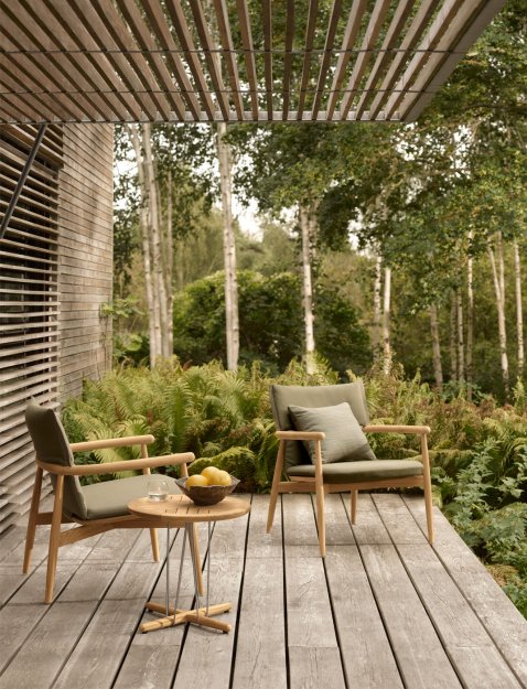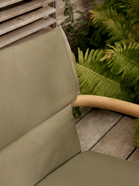 Rammen er fremstillet i massivt, FSC™-certificeret teak, som med tiden udvikler en smuk og naturlig patina. De aftagelige, vejrbestandige hynder tilfører ekstra komfort og skaber samtidig en elegant kontrast til det præcise træværk. Hynderne fås i afdæmpede nuancer inspireret af naturens farver.