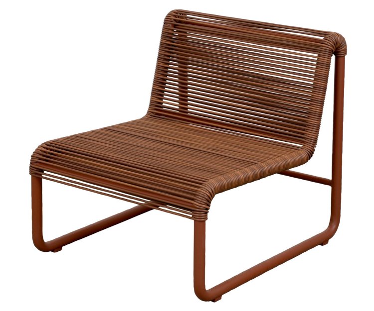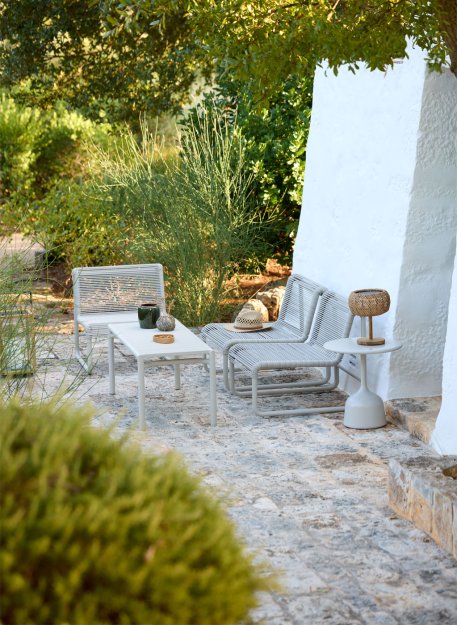 Sæde og ryglæn er håndflettet med slanke, spaghetti-inspirerede strenge, der skaber en let og gennemsigtig struktur. Det giver loungestolen et karakteristisk og legende design, som føles både nutidigt og tidløst. Det luftige udtryk gør stolen nem at kombinere med andre havemøbler og passer perfekt ind i moderne uderum.