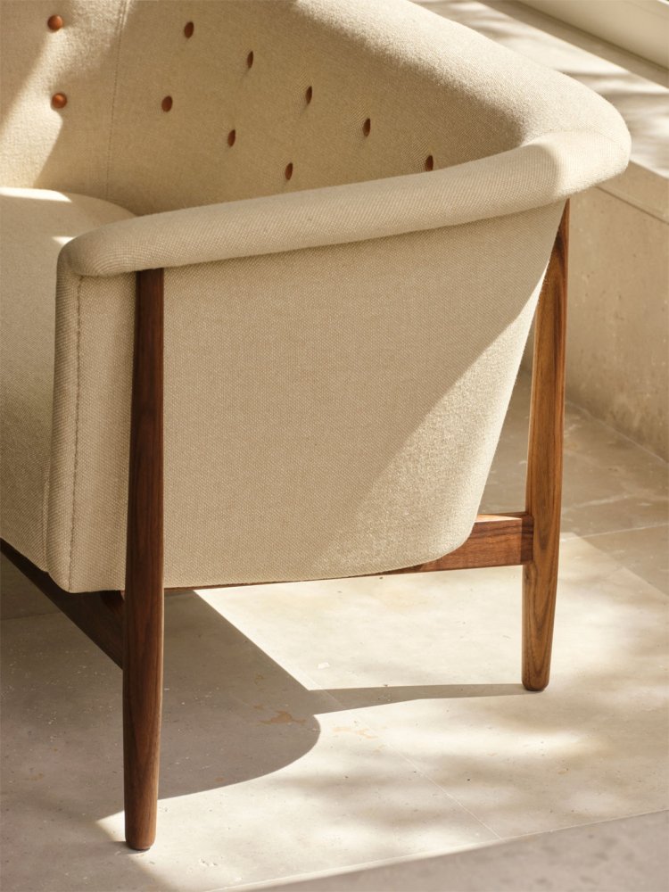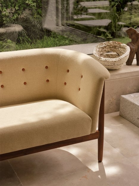 Sofaens let svungne, organiske skal løfter sig elegant fra en ramme i massivt træ, der giver møblet et let og luftigt udtryk. Den høje, omfavnende ryg understreger det skulpturelle formsprog og skaber en behagelig siddeoplevelse, mens den stramt udførte håndpolstring med knapper og præcise linjer tilføjer et raffineret visuelt fokus.