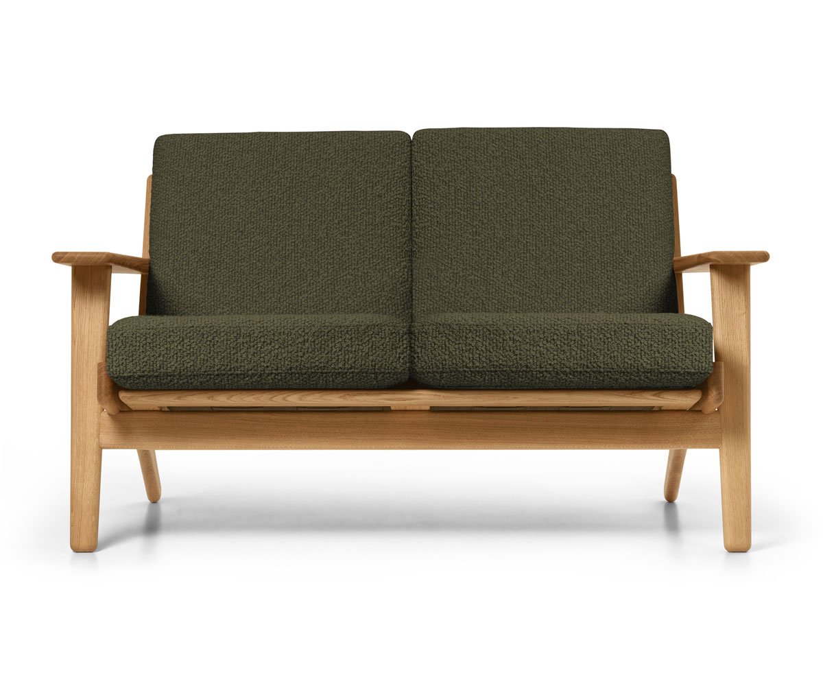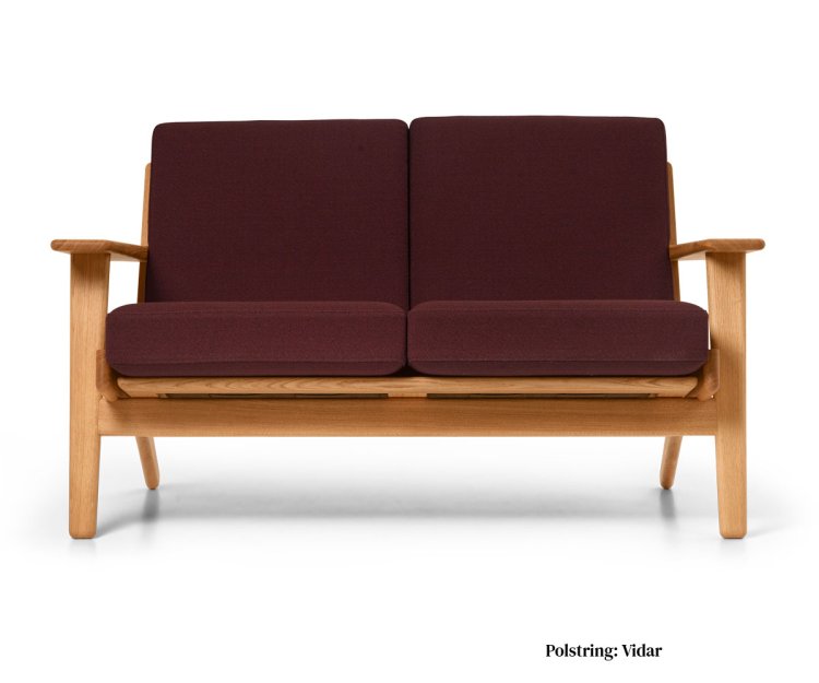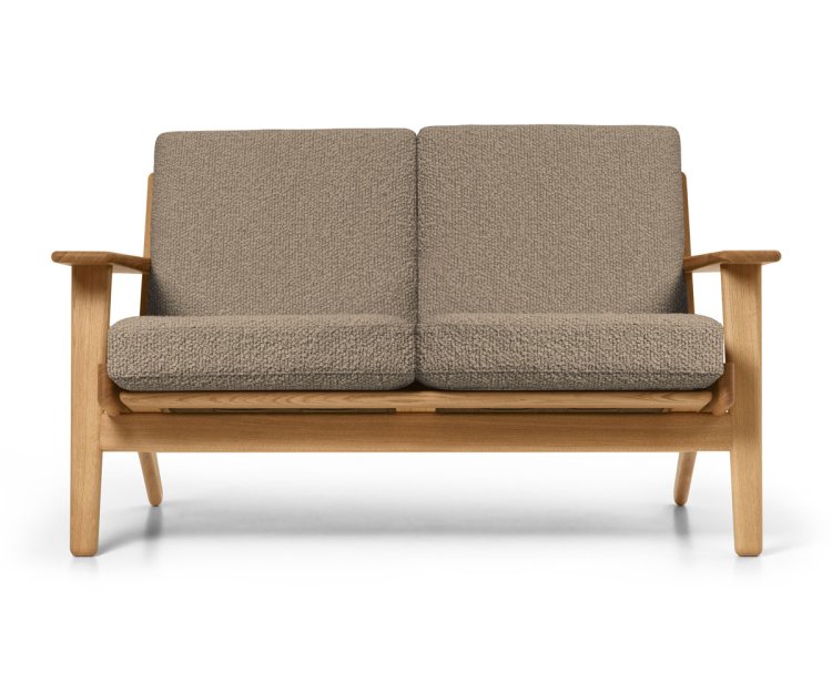 Den to-personers sofa består af to omhyggeligt polstrede sæde- og rygpuder, der understøttes af en FSC™-certificeret ramme i massivt egetræ. De synlige ryglænslister, brede armlæn og dynamisk vinklede bagben fremhæver Wegners typiske formsprog, mens de bløde hynder tilfører sofaen et ubesværet, indbydende udtryk.