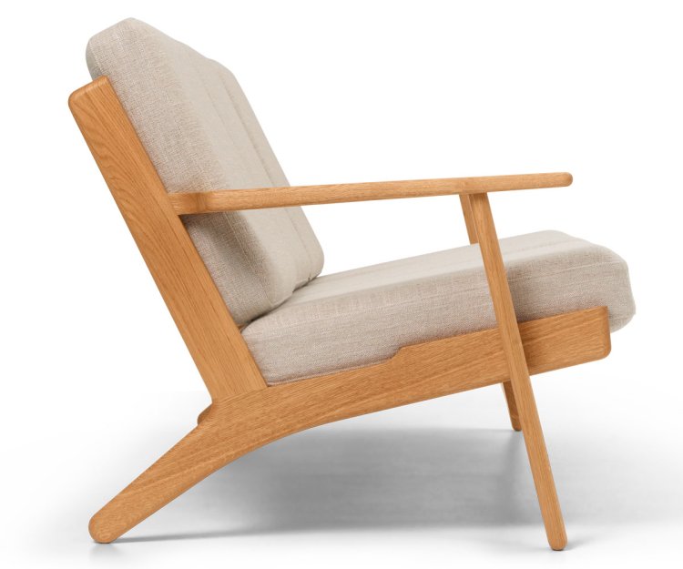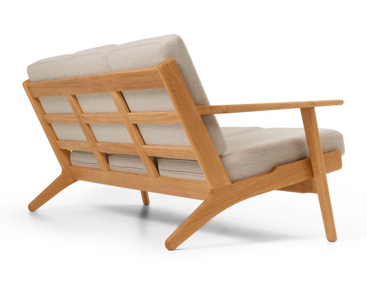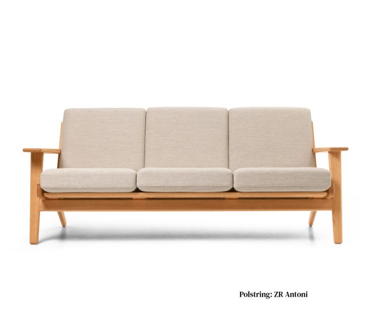 Sofaen er en 3-personers model med tre omhyggeligt polstrede sæde- og rygpuder, der understøttes af en FSC™-certificeret ramme i massivt egetræ. De synlige ryglænslister, brede armlæn og dynamisk vinklede bagben afspejler Wegners karakteristiske formsprog, mens den bløde, aftagelige polstring tilfører sofaen et afslappet og indbydende udtryk.