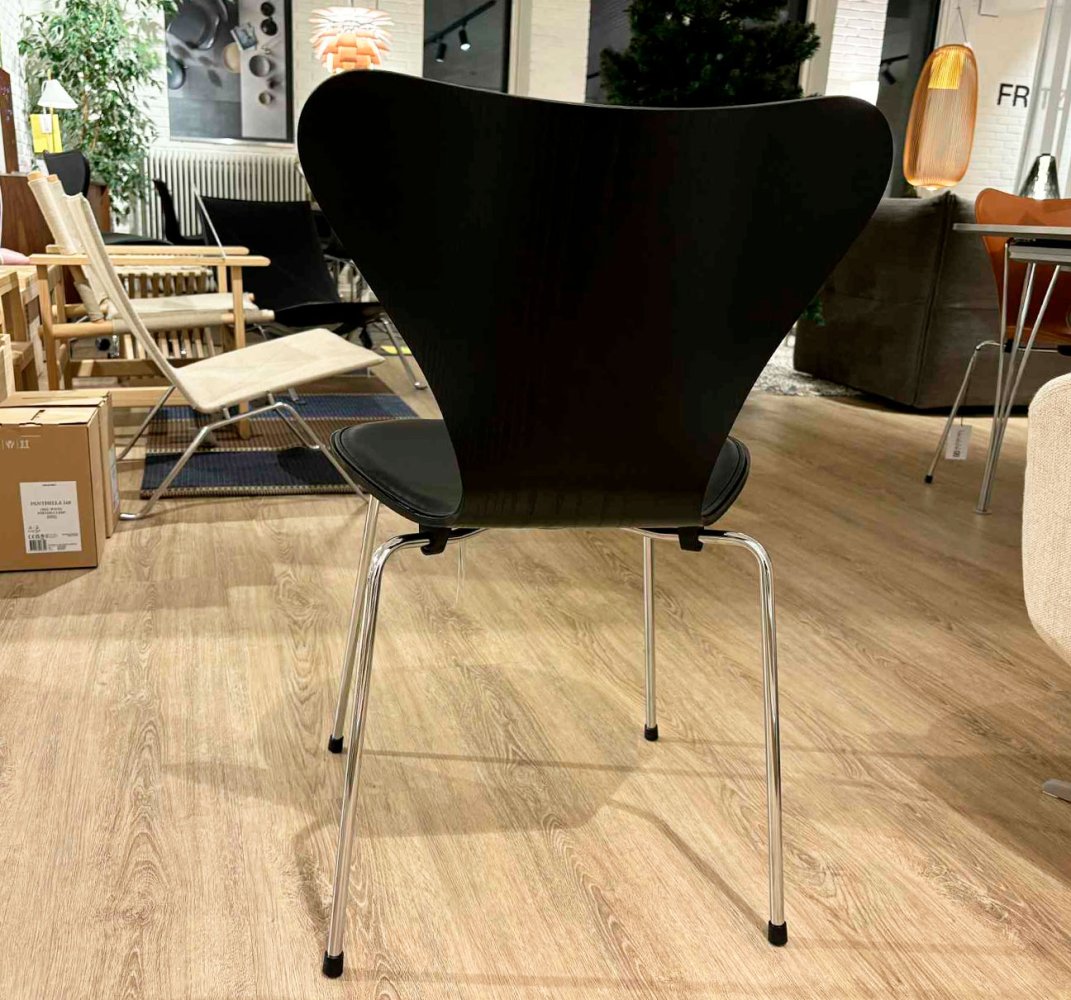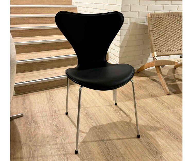 Den slanke, forkromede stålkonstruktion understøtter stolens lette og skulpturelle udseende, mens den ergonomiske form sikrer en behagelig siddeoplevelse. Kombinationen af polstring og træets naturlige skønhed gør denne version af 3107 både moderne og klassisk på én gang.