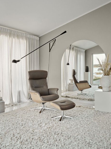 Puzzle lænestolen fås med drejefod og quattro fod. Derudover kan du øje komforten ved at tilkøbe en fodskammel. Denne variant er med quattro fod på både lænestol og fodskammel.