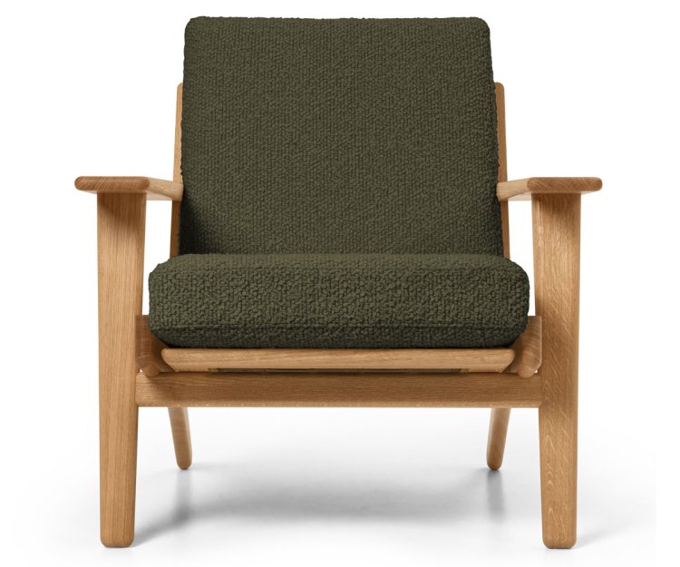 Med sit karakteristiske stel i massiv eg og dynamisk vinklede ben fremviser CH290 den præcision og balance, der kendetegner Wegners bedste værker. De brede, flade armlæn indrammer det afslappede udtryk, mens de synlige samlinger og den lamelformede ryg understreger stolens ærlige konstruktion.