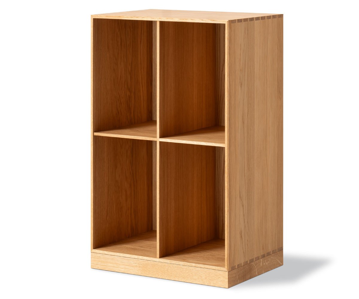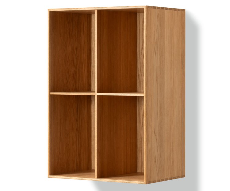Reolen er udført i massiv eg og konstrueret med klassiske snedkerdetaljer, herunder synlige sinkesamlinger i hjørnerne, som giver modulet styrke og stabilitet. Materialets ærlighed og den nøgterne formgivning understreger, hvorfor MK 67 er en reol af Mogens Koch, hvor funktion, proportion og håndværk går op i en tidløs helhed.