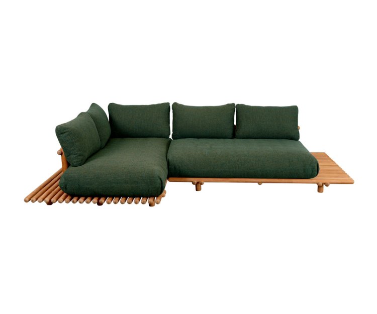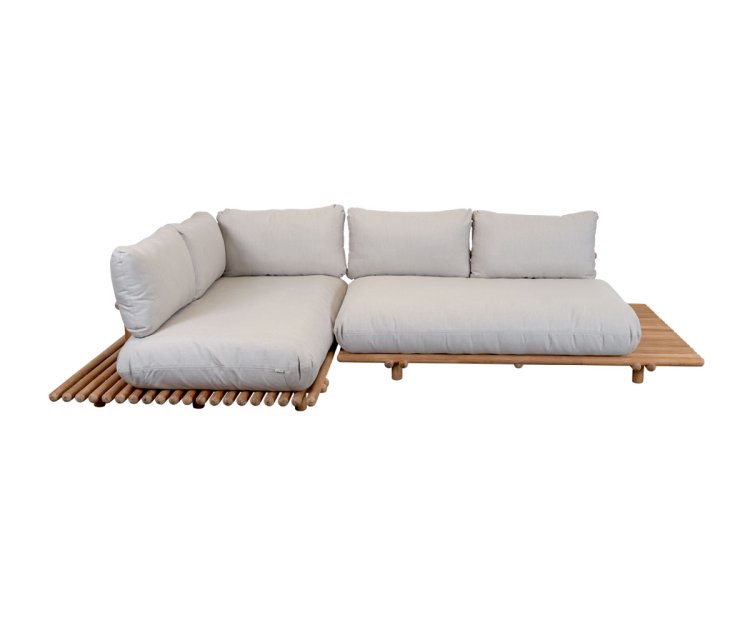 Teaktræet tilfører hjørnesofaen en varm og eksklusiv karakter, som giver udendørsmøblet et naturligt og levende udtryk. Cane-line anvender certificeret teak, der er kendt for sin styrke og sit naturlige olieindhold, hvilket gør træet særligt modstandsdygtigt over for fugt og skiftende vejrforhold. Teak leveres ubehandlet og vil med tiden udvikle en smuk sølvgrå patina. Ønsker du at bevare den gyldne farve, kan træet behandles med teakolie et par gange om året. Små variationer i struktur og farve er en naturlig del af træets karakter og bidrager til, at hver sofa får sit eget unikke udtryk.