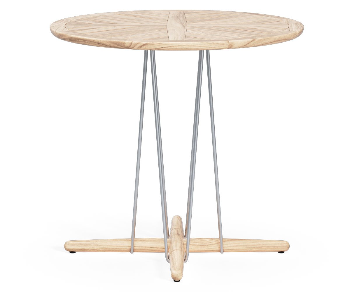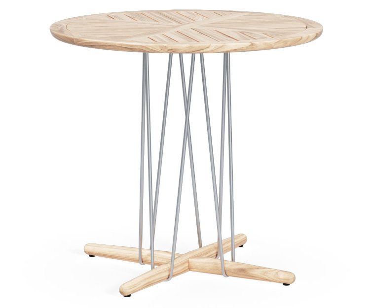 Bordet er fremstillet i FSC™-certificeret, ubehandlet teaktræ, som med tiden udvikler en smuk, naturlig patina. Den runde bordplade hviler på en karakteristisk konstruktion bestående af en stabil trefod og et elegant wirestel i rustfrit stål, der skaber en harmonisk kontrast mellem det varme træ og de industrielle elementer. Resultatet er et let, næsten svævende design med et dynamisk og moderne udtryk.