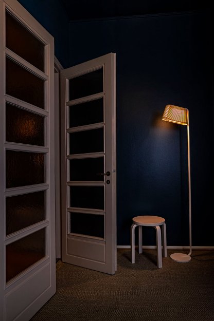Gulvlampen er ideel ved siden af sofaen, i et læsehjørne eller langs en væg, hvor dens smukke silhuet virkelig kommer til sin ret. Kombinationen af det naturlige træ og den solide base i pulverlakeret stål giver et harmonisk samspil mellem varme materialer og moderne minimalisme.